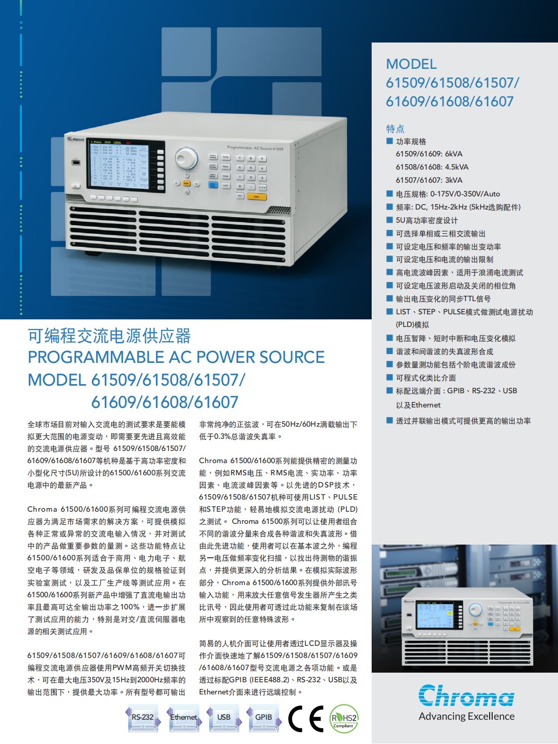 Chroma进阶可编程交流电源MODELMODEL 61509/61508/61507/ 61609/61608/61607