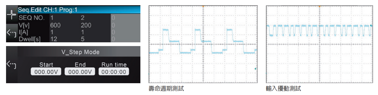 62000E系列直流电源具有100步的可编程步骤设定,使用者可透过List Mode自定义编辑所需输出波形,停留时间(Dwell Time)10ms-65535s控制,可满足许多测试需求,应用的范围包括DC/DC转换器和逆变器的压降测试、零组件产品寿命周期测试及飞机航空测试等等。