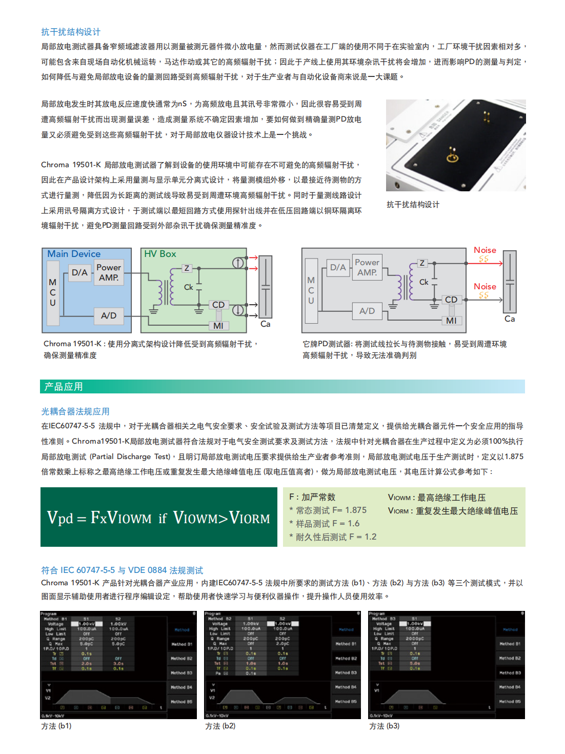 Chroma 19501-K局部放电测试器内建交流耐电压测试(Hipot Test)与局部放电(PartialDischarge,PD)侦测功能于一单机,提供交流电压输出0.1kV~10kV,漏电流测量范围0.01μA~300μA,局部放电侦测范围1pC~2000pC,针对高压半导体元件与高绝缘材料测试应用所设计与开发。
